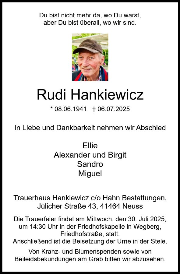 wir wünschen Ihnen von Herzen viel Kraft, dass Sie Menschen um sich haben, die Ihnen in dieser schweren Zeit beistehen und Halt geben. Zusätzlich können Sie auf dieser Gedenkseite Erinnerungen teilen und so das Andenken gemeinsam wachhalten.